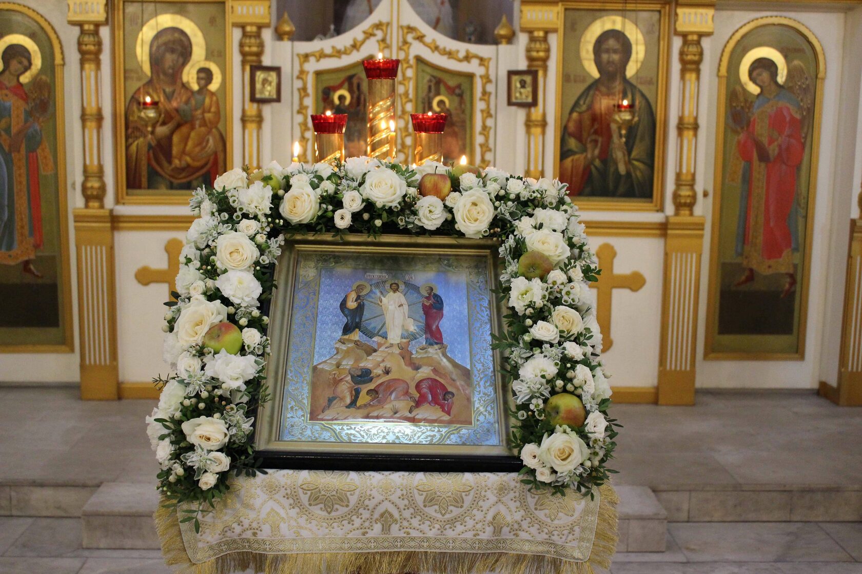 Преобразился еси на горе, Христе Боже, / показавый учеником Твоим славу Твою, / якоже можаху:/ да возсияет и нам грешным/ свет Твой присносущный, / молитвами Богородицы, / Светодавче, слава Тебе.