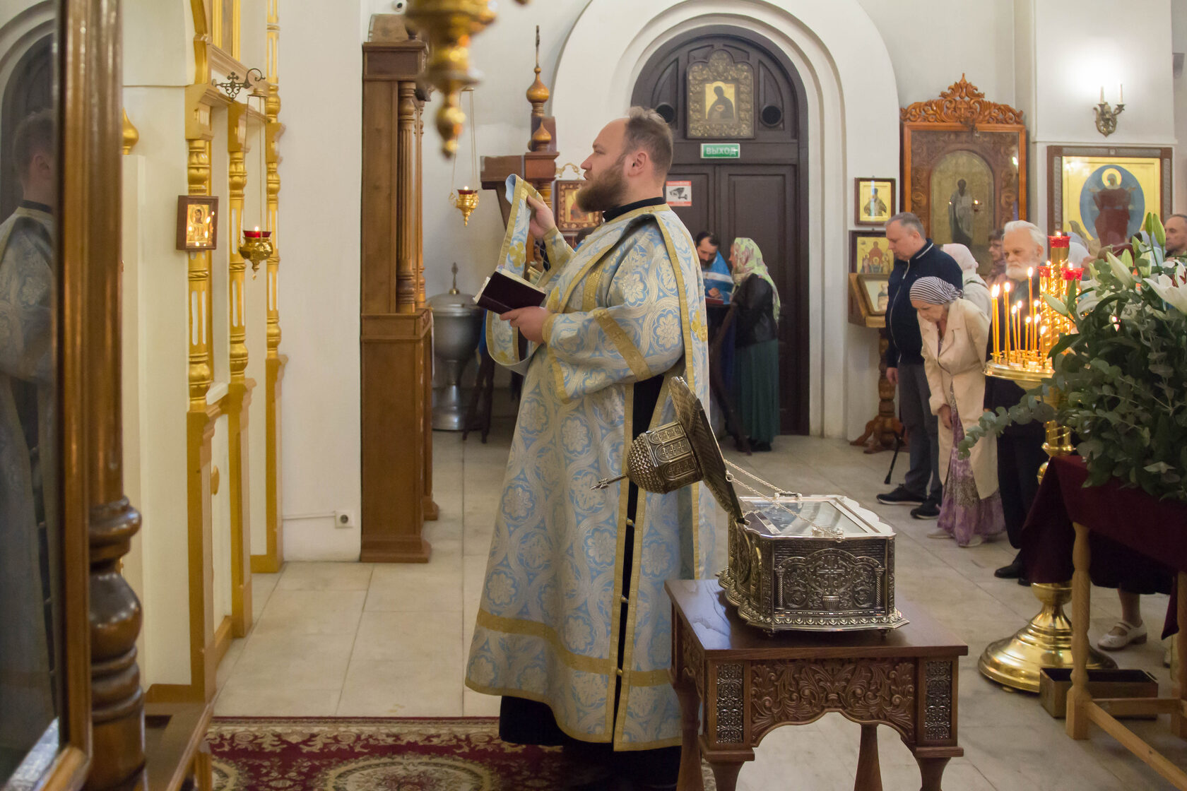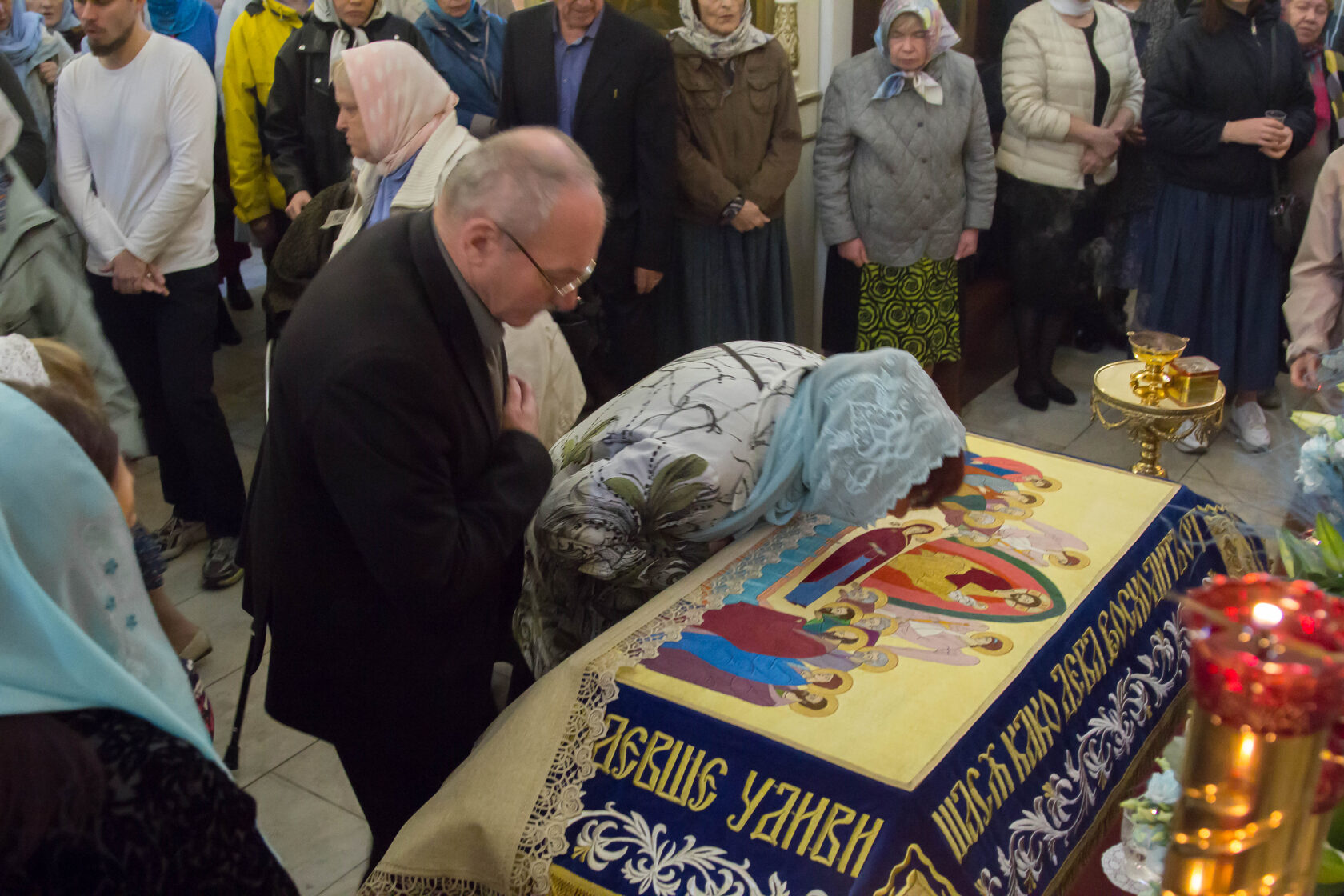 После великого славословия при пении заключительного «Святый Боже» (как при выносе Креста) духовенство с плащаницей совершило вокруг храма крестный ход, во время которого хор пел тропарь праздника и звучал трезвон.