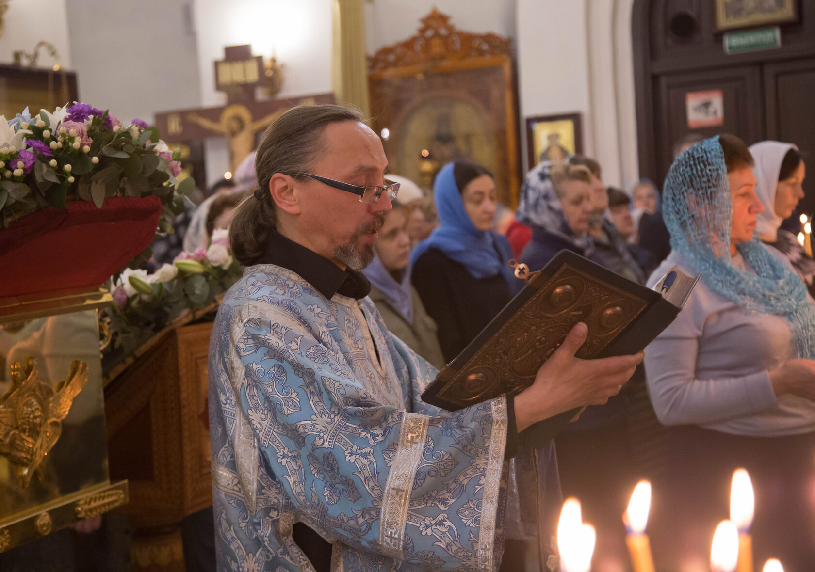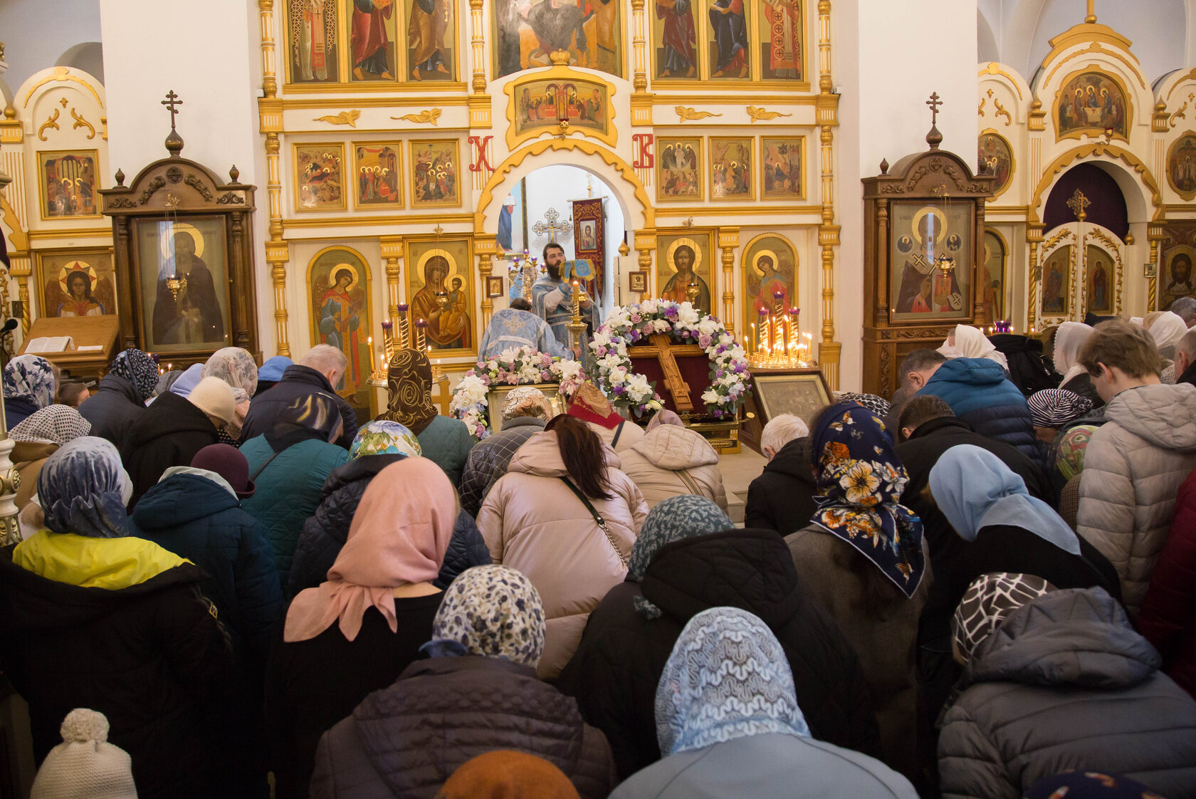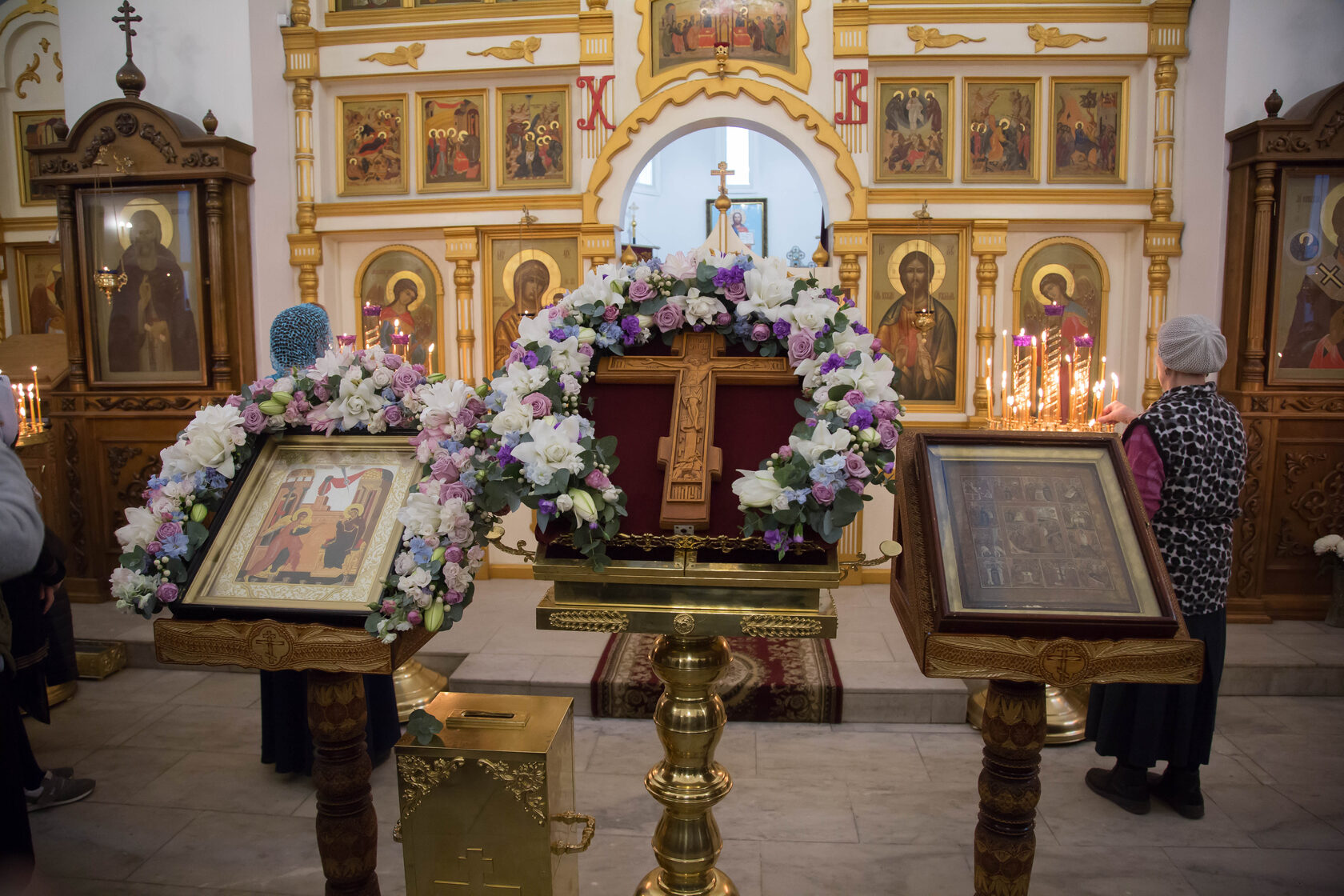 В этом году 7 апреля также было посвящено Кресту Господню, поэтому накануне 6 апреля на всенощном бдении на середину храма был вынесен украшенный крест. Крест будет находиться в центре храма до пятницы, когда его внесут обратно в алтарь.