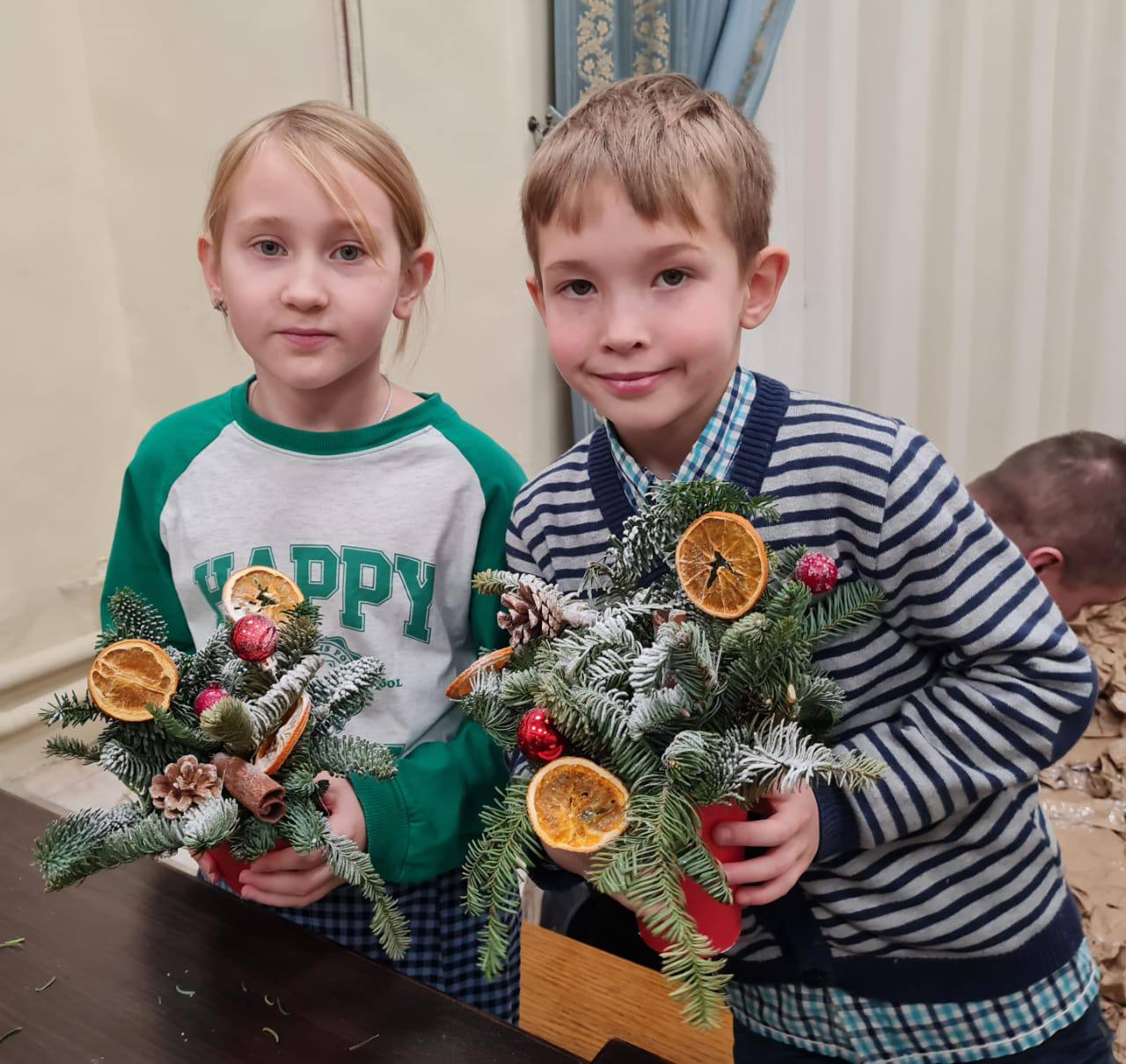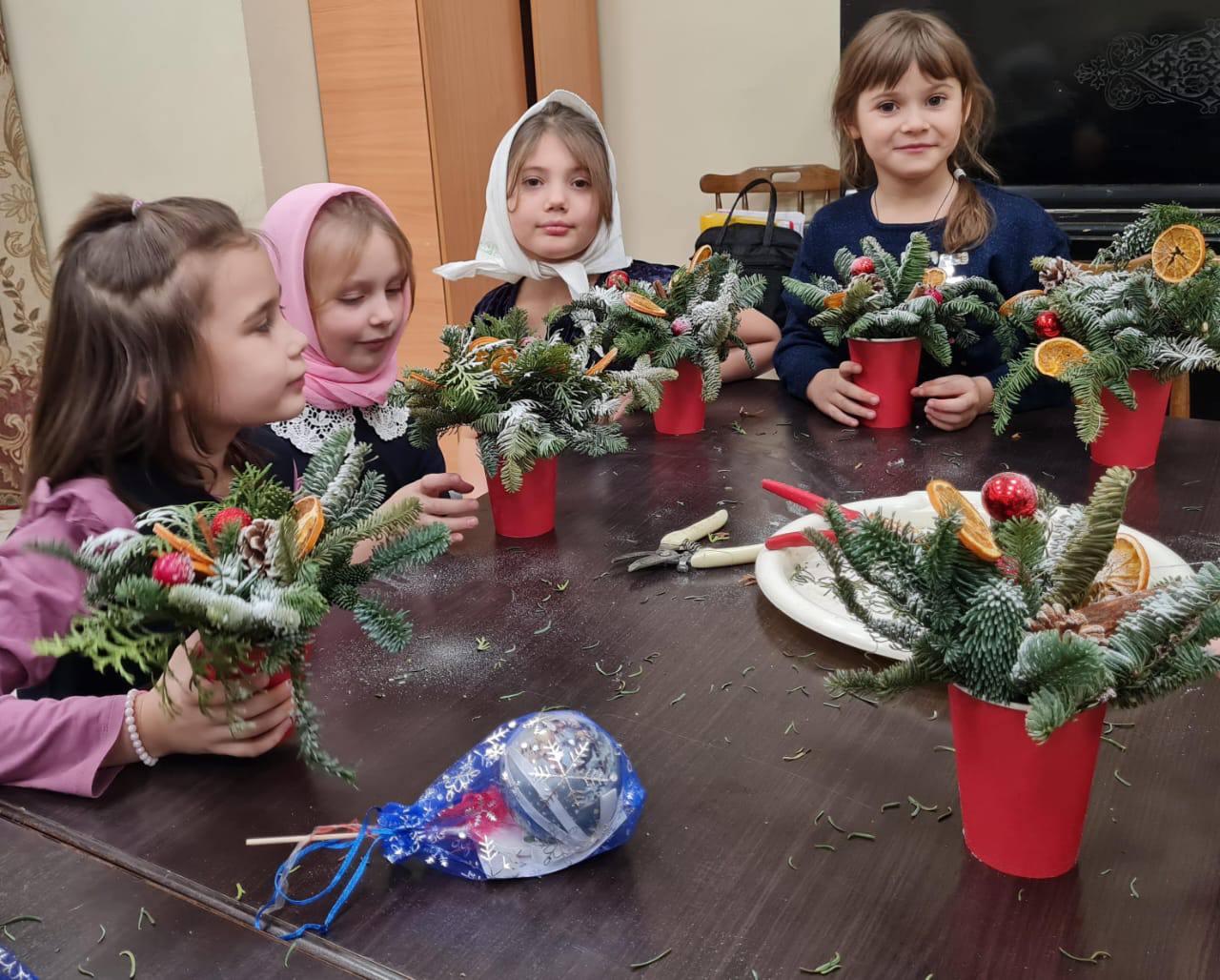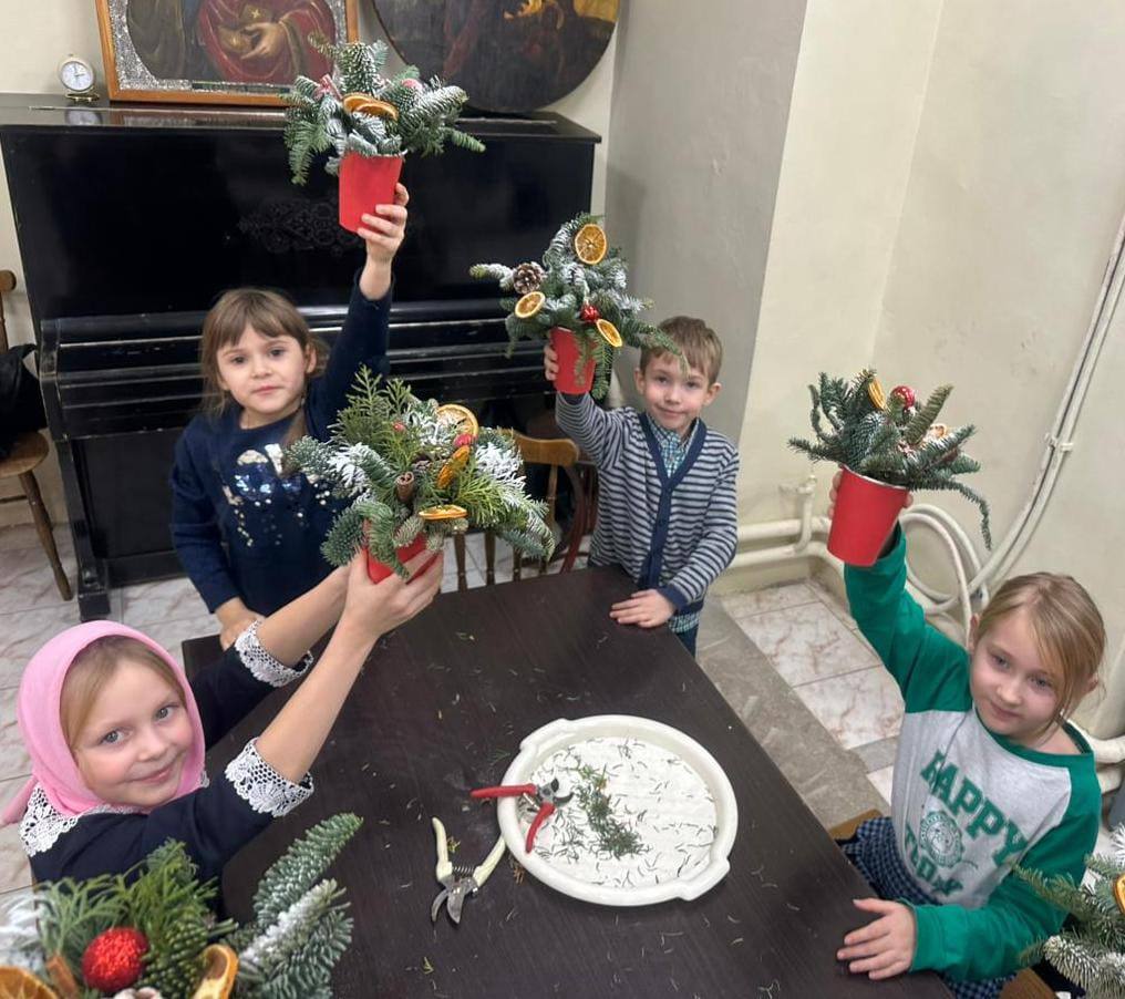 Также флорист и прихожанка храма Екатерина провела мастер-класс, на котором научила создавать детей Рождественские букеты. Ребята сделали замечательные праздничные композиции, которые будут их радовать все каникулы.