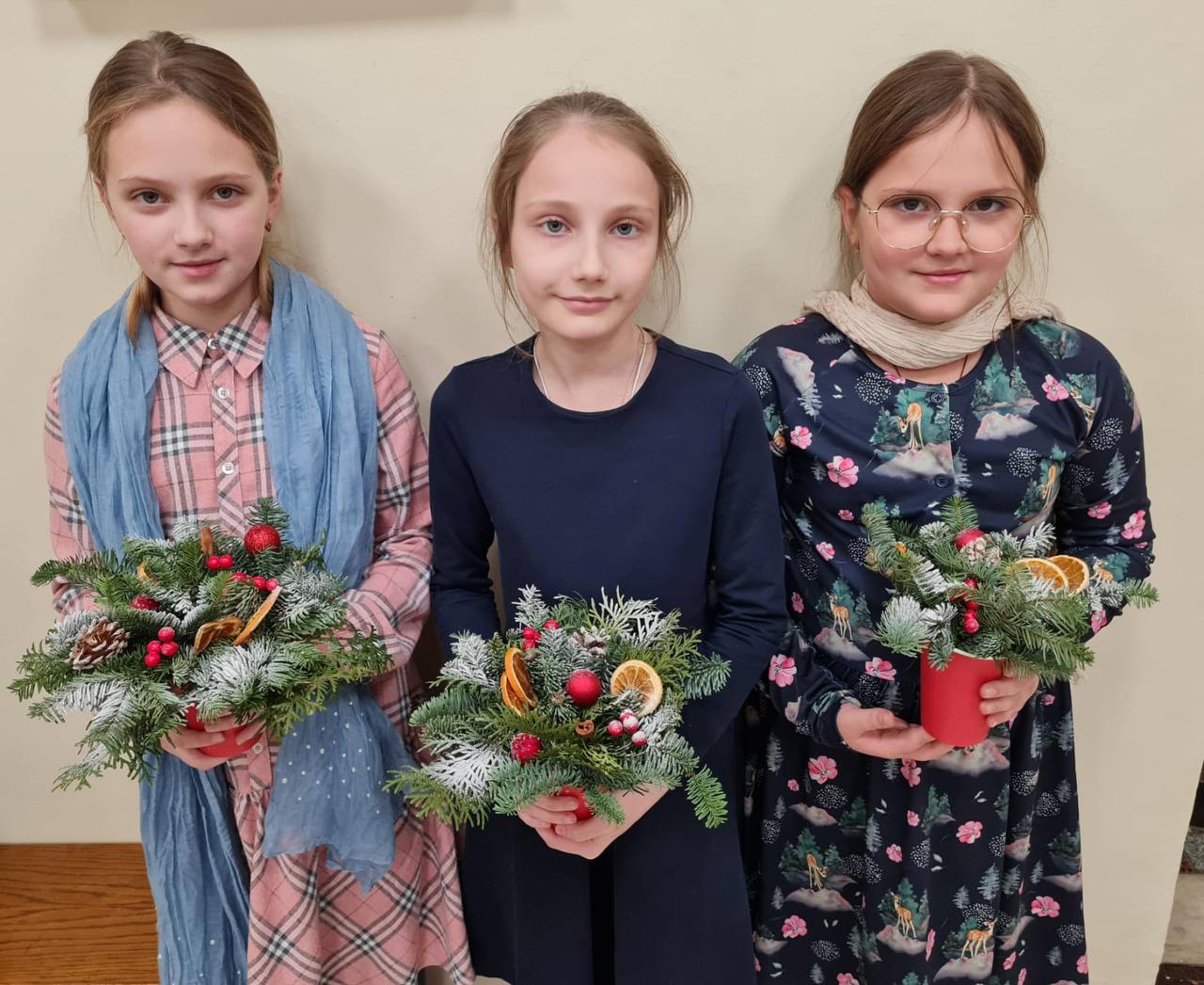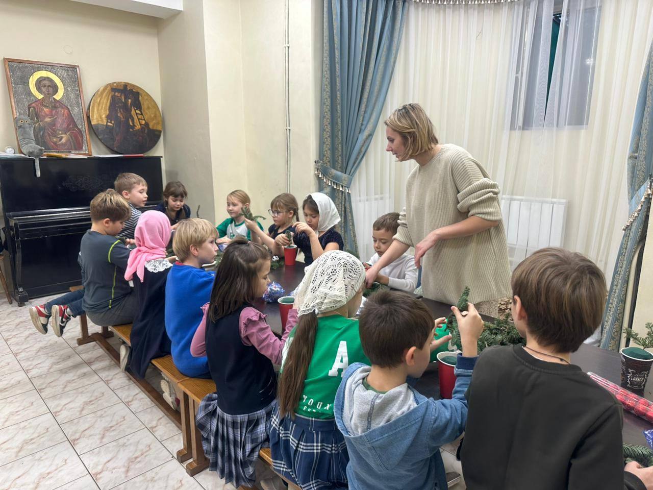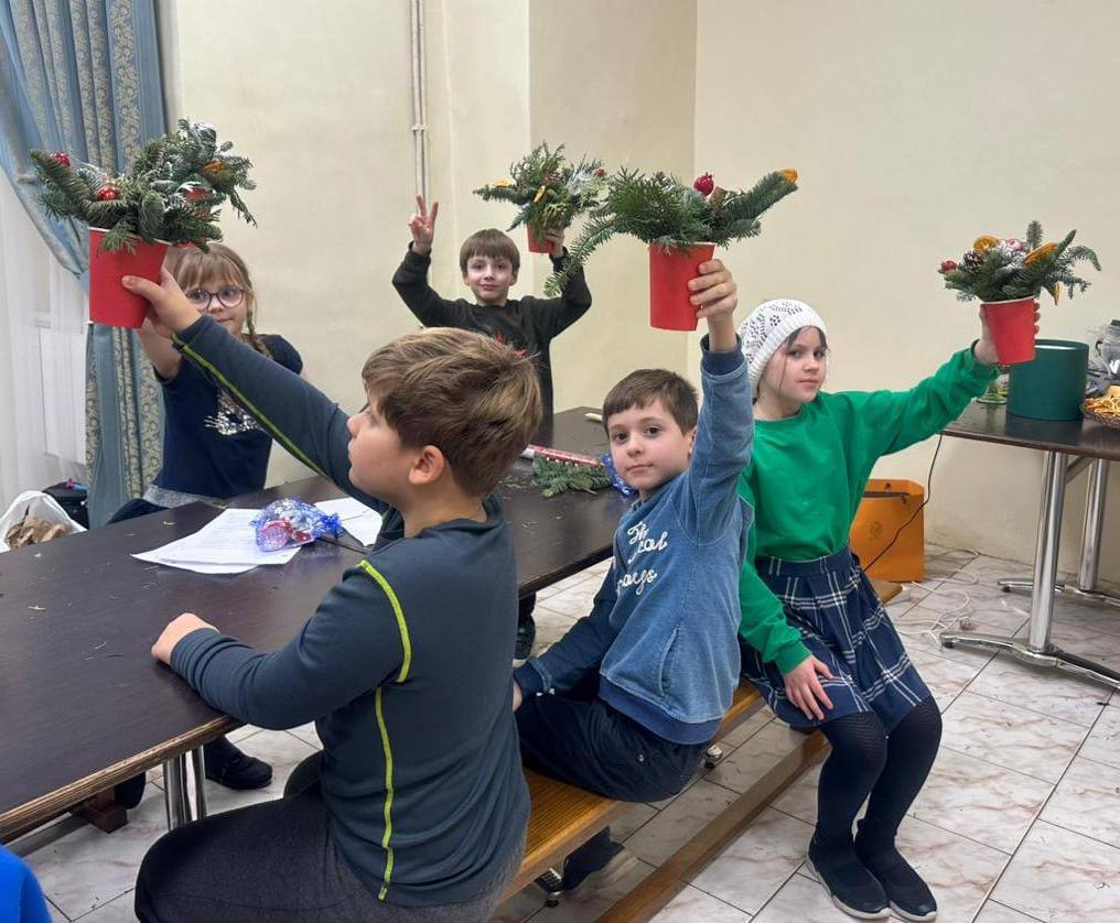 Также флорист и прихожанка храма Екатерина провела мастер-класс, на котором научила создавать детей Рождественские букеты. Ребята сделали замечательные праздничные композиции, которые будут их радовать все каникулы.